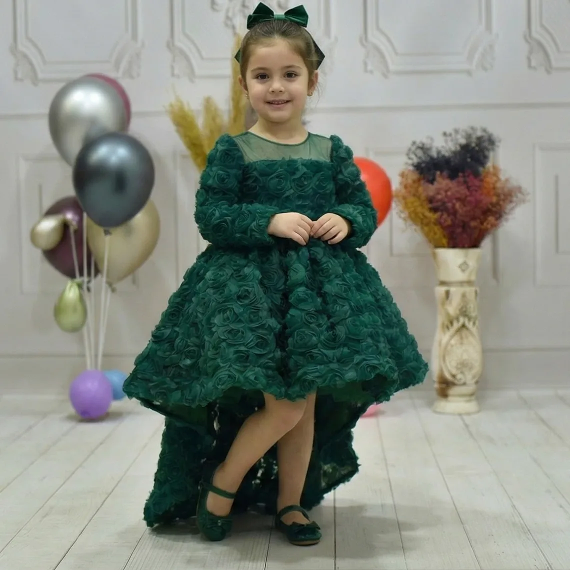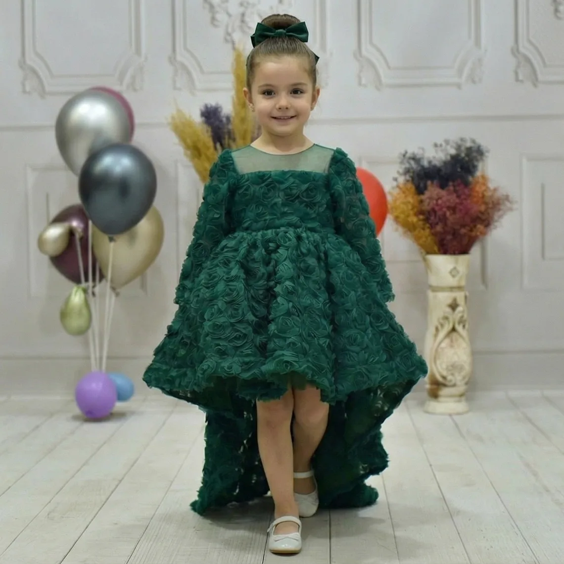 Kız çocuklar için özel olarak tasarlanan Elussi marka Zümrüt Yeşili Gül Desenli Kuyruklu Uzun Kol Elbise Abiye, şıklık ve zarafeti bir arada sunuyor.